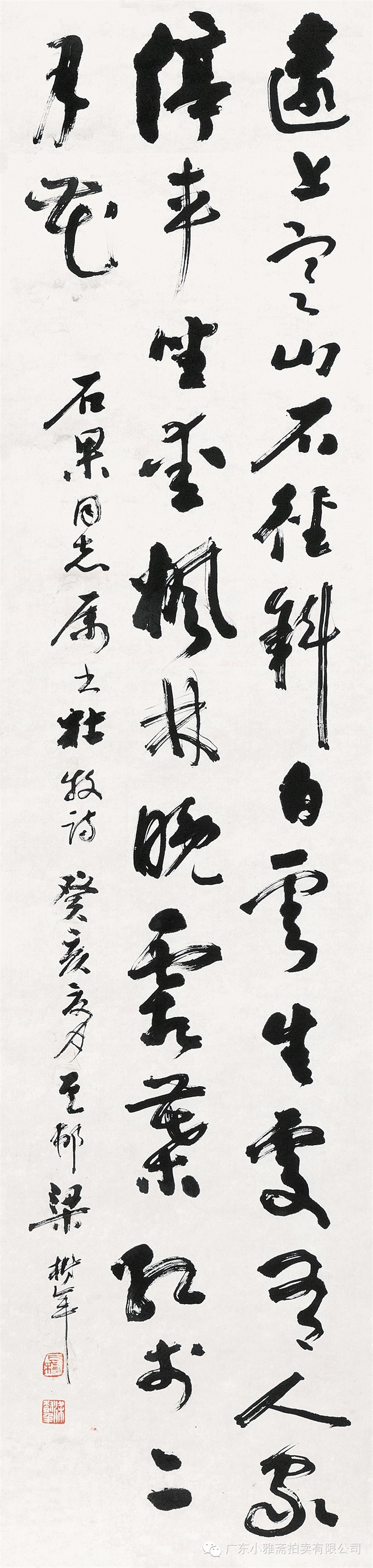 款识:远上寒山石径斜,白云生处有人家。停车坐爱枫林晚,霜叶二月花。石果同志属书杜牧诗。癸亥夏月,豆邨梁树年。