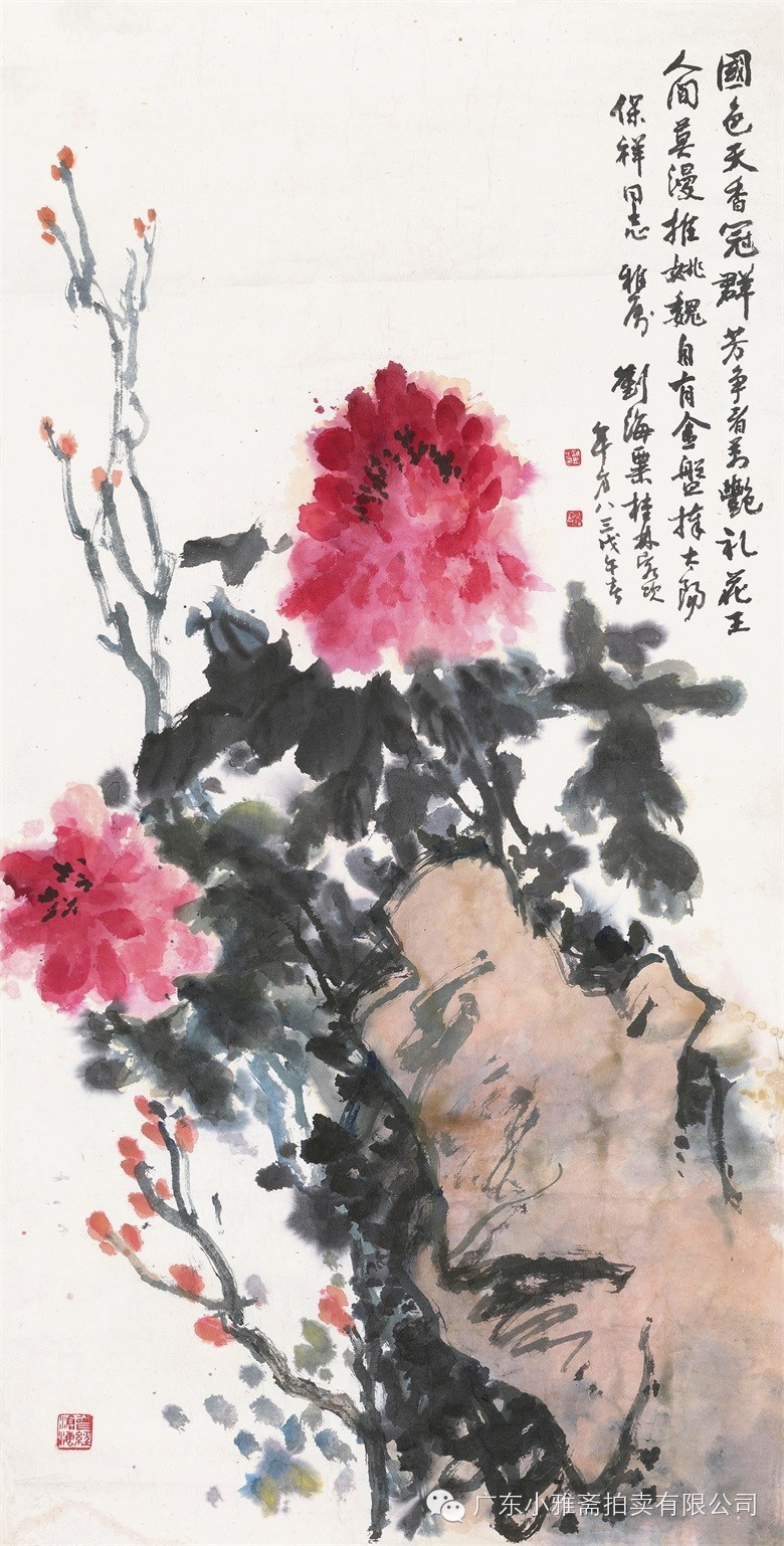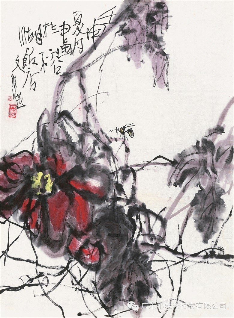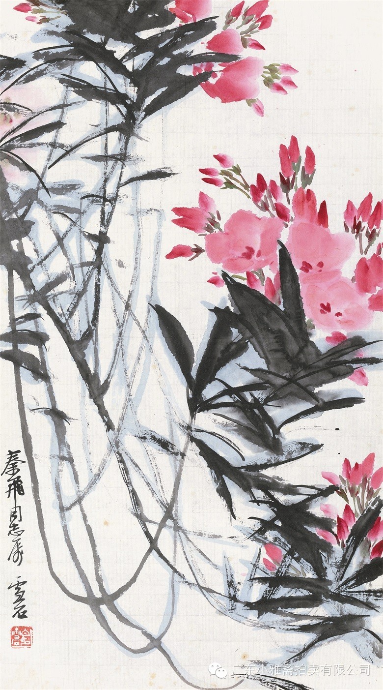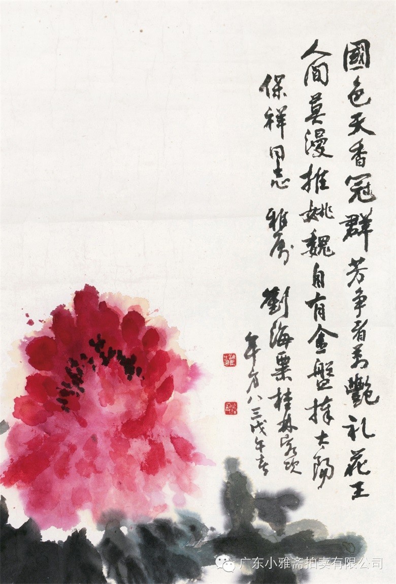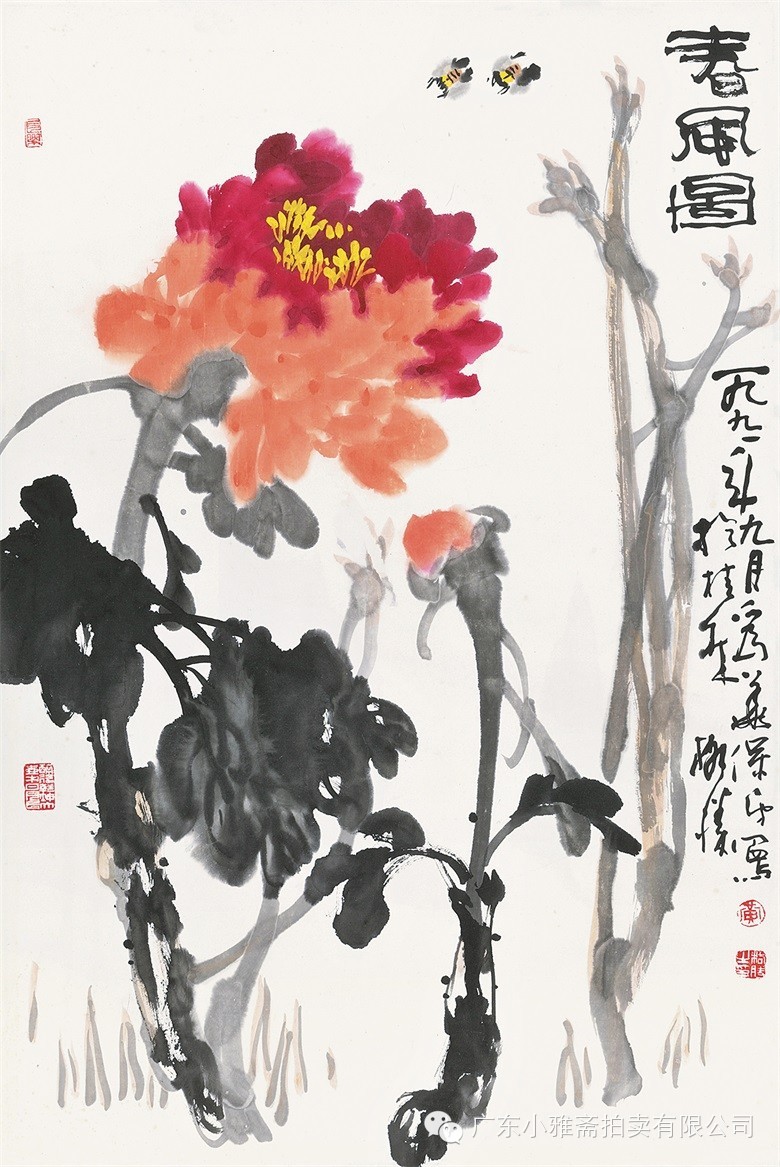 说明:上款人谢天成(b.1950),广东茂名市人。刘海粟先生的得意门生。刘海粟艺术研究院院长,北京大学资源学院客座教授,上海电影艺术学院客座教授,全国城市雕塑建设指导委员会委员,广西大学艺术学院客座教授。拍品由上款人得自画家本人。
