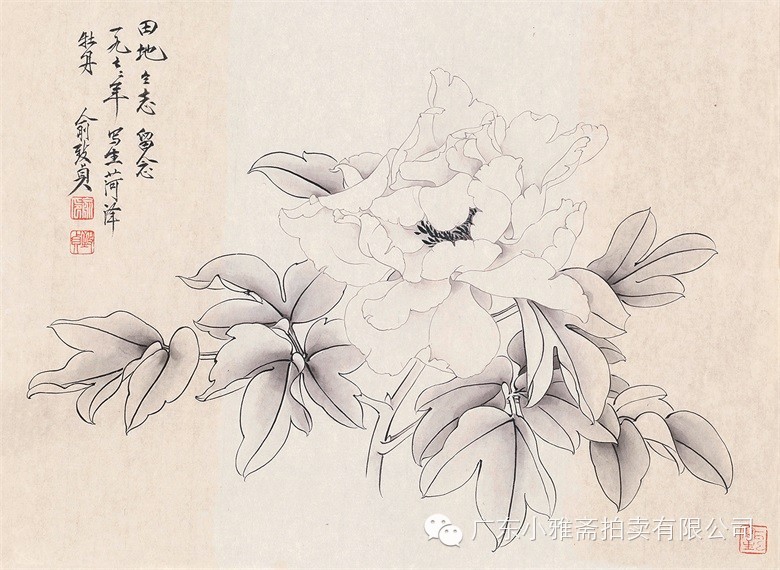 款识:田地同志留念。一九七七年写生荷泽牡丹,俞致贞。