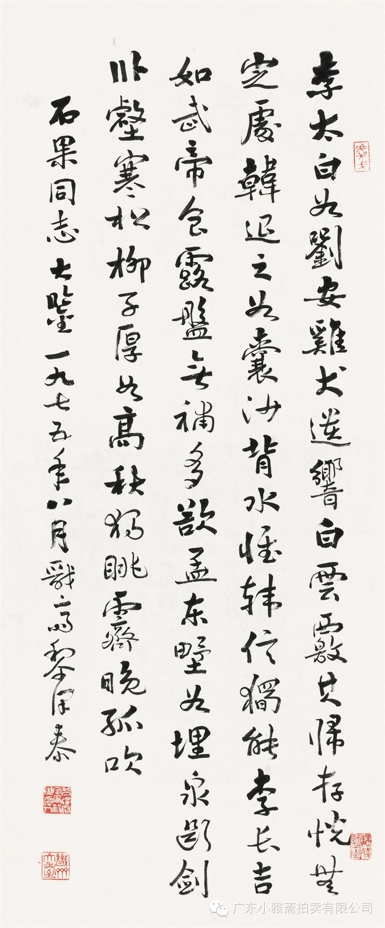 款识:李太白如刘安,鸡犬送响,白云核其归存,恍无定处。韩退之如囊沙背水,惟韩信独能。李长吉如武帝食露盘,无补多欲。孟冬野如埋泉断剑,卧壑寒松。柳子厚如高秋独眺,霁晚孤吹。石果同志大鉴。一九七五年八月,戬斋黎泽泰。