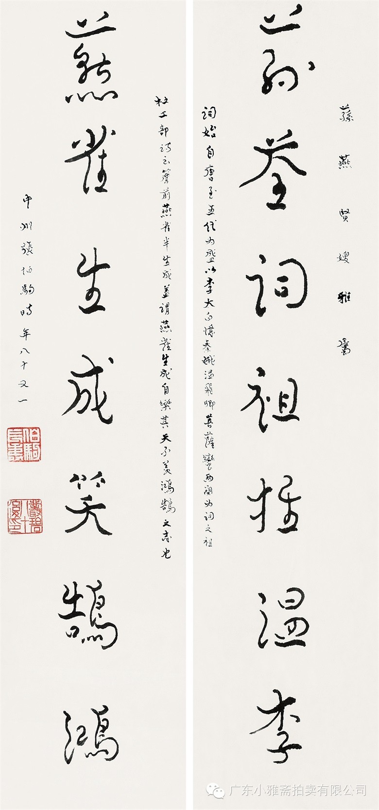 款识:荪荃词祖推温李,燕崔生成笑鹄鸿。词始自唐,至五代为盛。以李太白忆秦娥,温飞卿菩萨蛮两阕为词之祖。杜工部诗云“檐前燕崔半生成”盖谓燕雀生成自乐其天,不羡鹄鸿之志也。荪燕贤嫂雅属。中州张伯驹时年八十又一。
