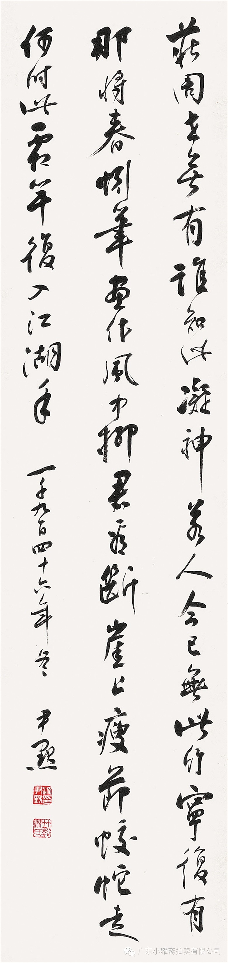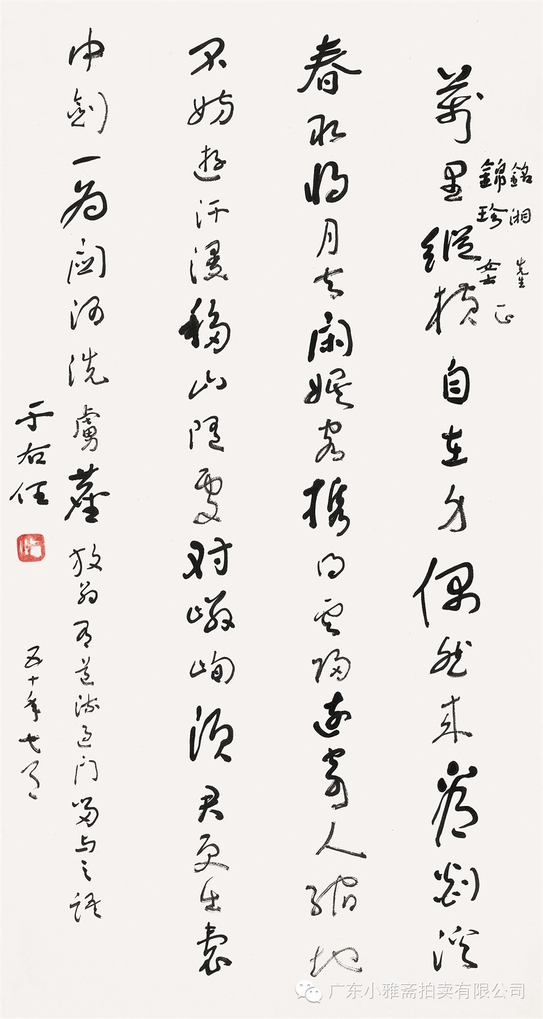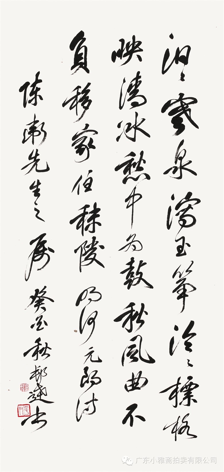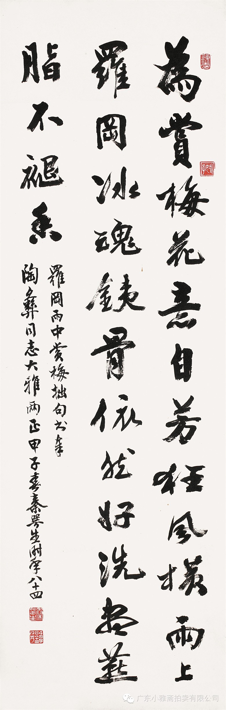 款识:为赏梅花意自芳,狂风横雨上罗冈。冰魂铁骨依然好,洗尽燕脂不退香。罗冈雨中赏梅拙句,书奉陶彝同志大雅两正。甲子春,秦咢生时年八十四。