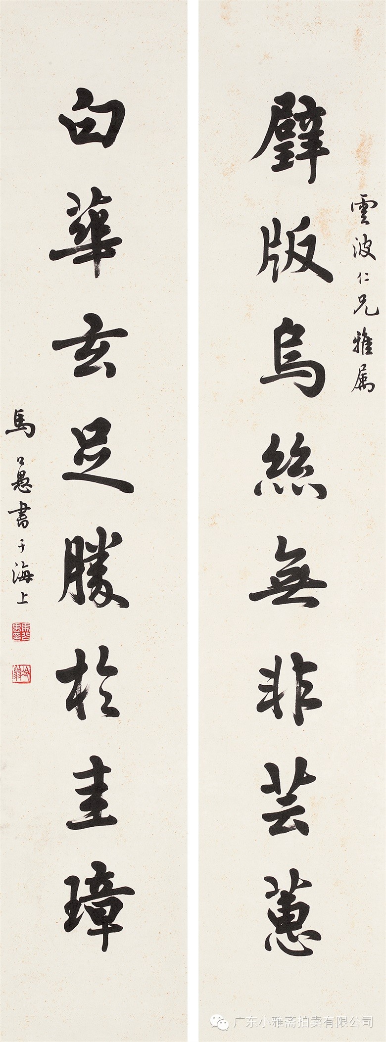 款识:璧版乌丝无非芸蕙,白华玄足胜于圭璋。云波仁兄雅属,马公愚书于海上。