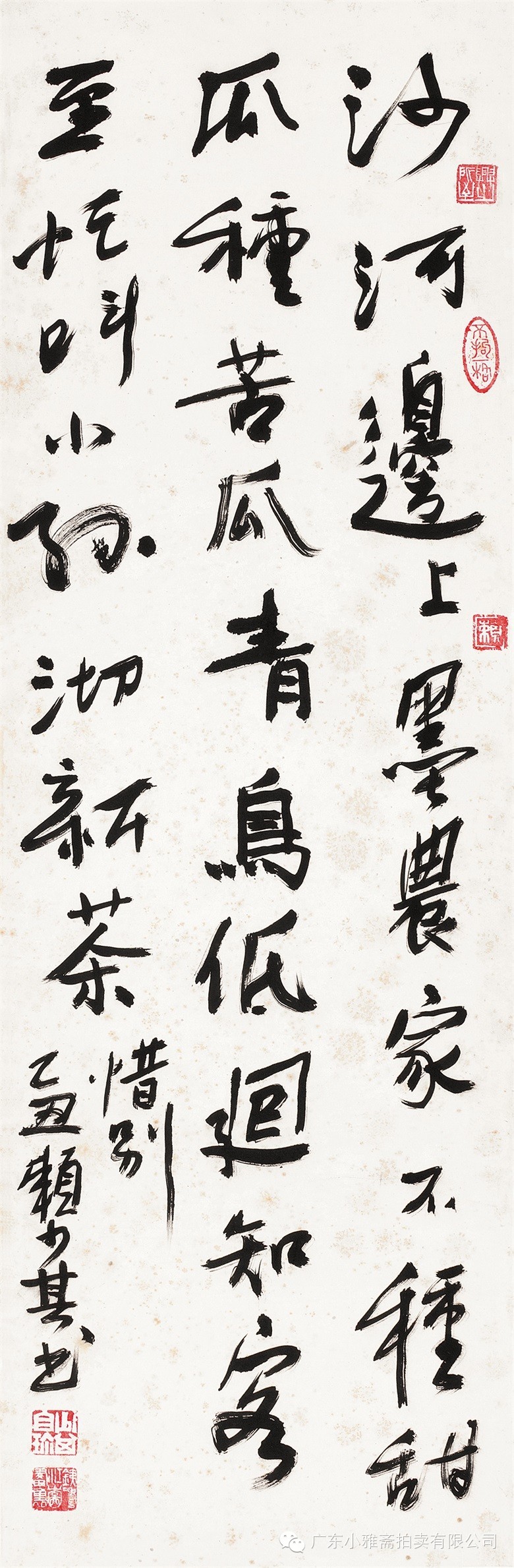 款识:沙河边上墨农家,不种甜瓜种苦瓜。青鸟低回知客至,忙叫小孙沏新茶。《惜别》。乙丑,赖少其书。