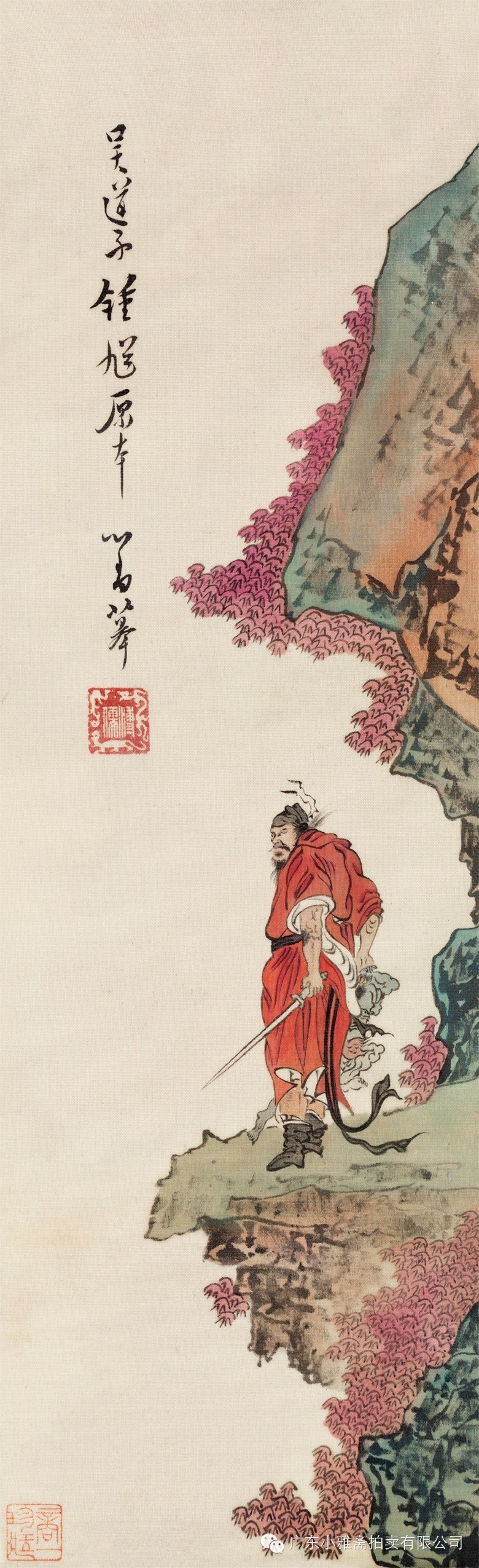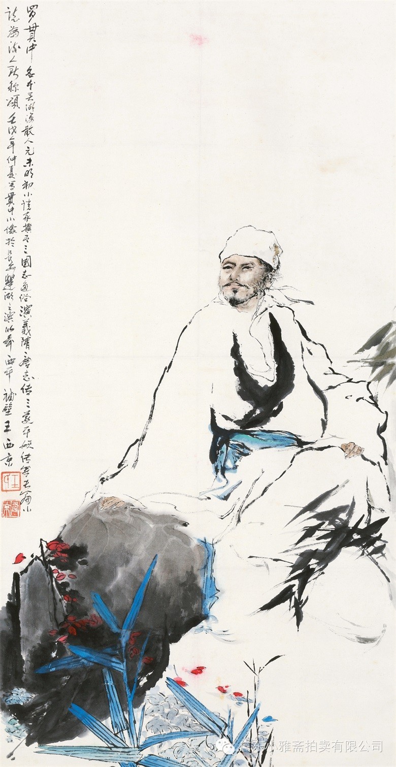 款识:罗贯中名本吴湖,海散人。元末明初小说家,撰有《三国志通俗演义》、《随唐志传》、《三遂平妖传》等长篇小说,为后人所称颂。壬戌年仲夏写贯中小像于长安莲湖之滨,以奉西平补壁,王西京。