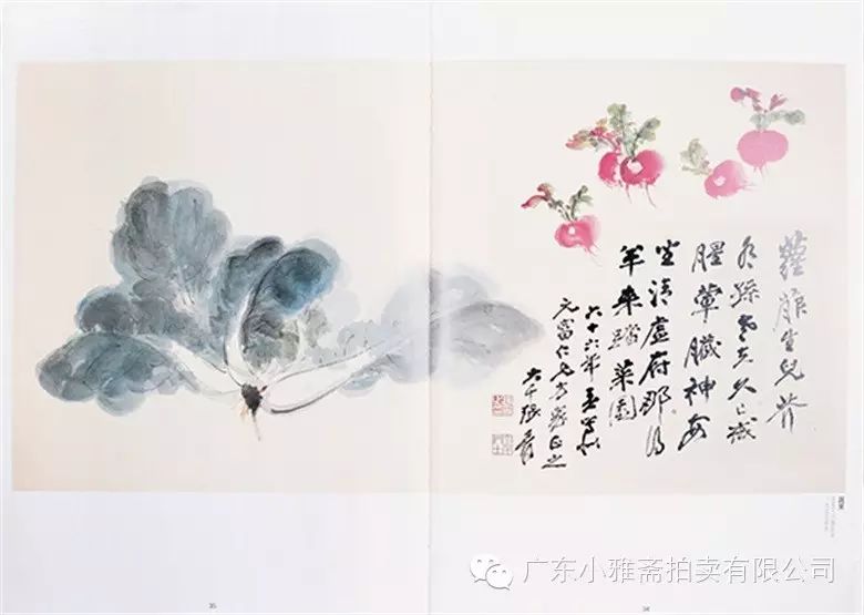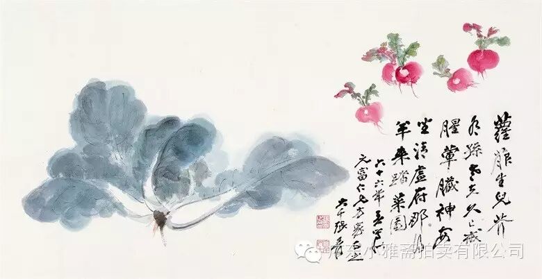 款识:萝菔生儿芥有孙,老夫久已戒腥荤。脏神安坐清虚府,那许羊来踏菜园。六十六年春写似元富仁兄方家正之,大千张爰。