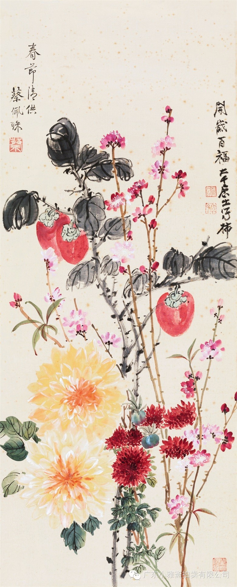 款识:开岁百福,大千居士写柿。春节清供,蔡佩珠。