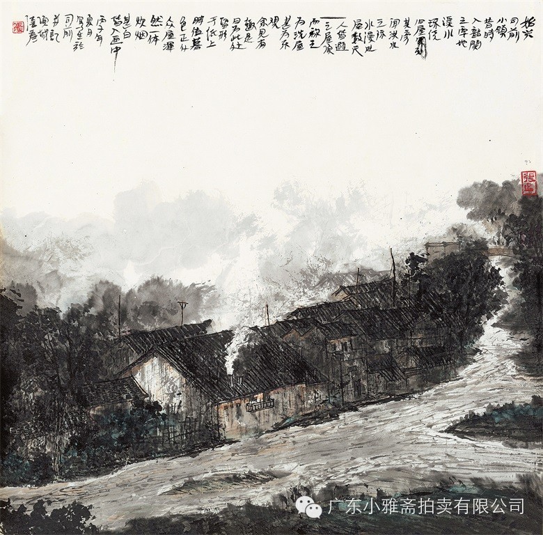 款识:长林幕阴云,苍翠滴深坞。有鸟投故枝,炊烟起缕缕。丙寅冬月,白龙山人写。