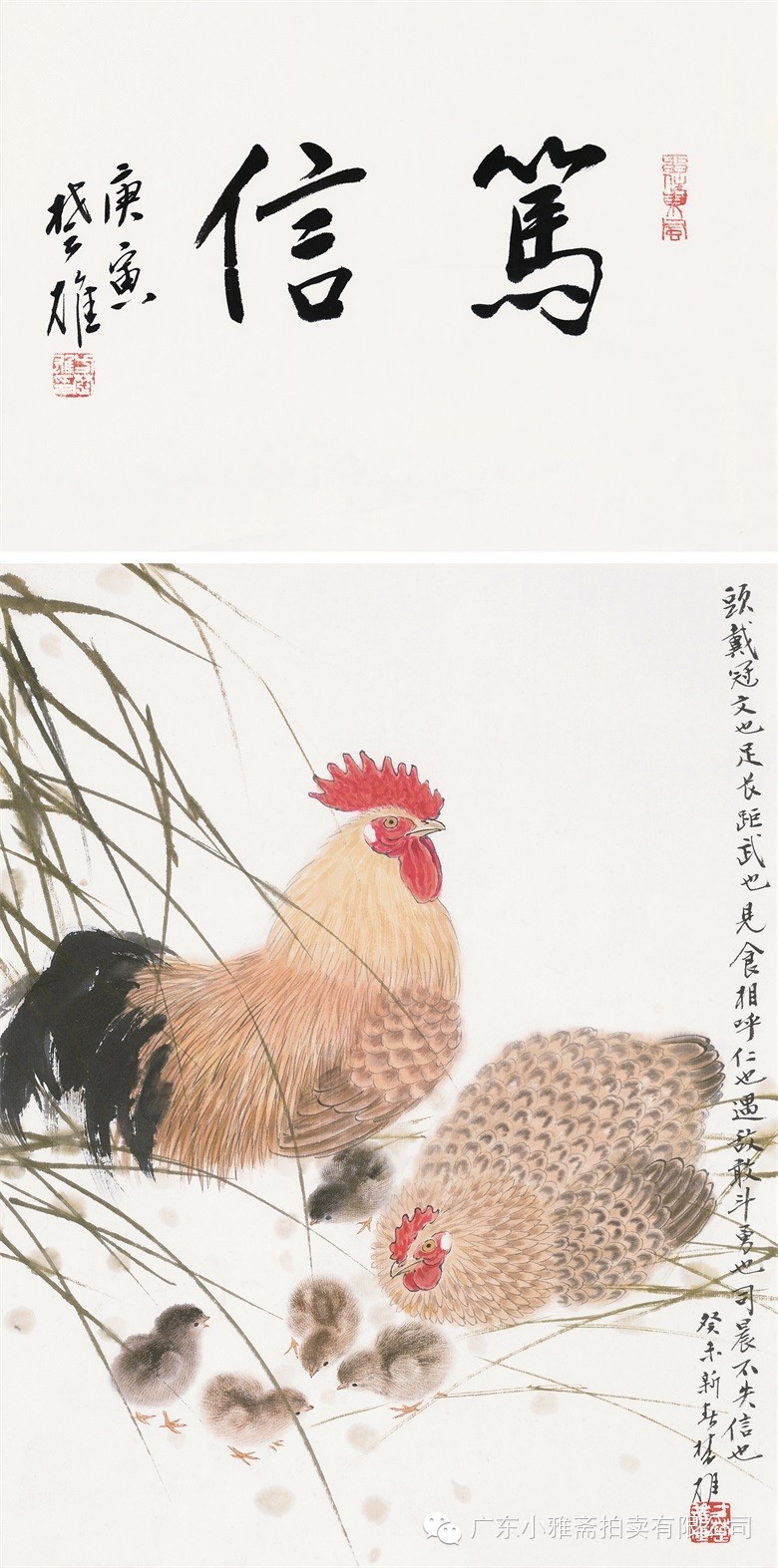 ② 头戴冠,文也。足长距,武也。见食相呼,仁也。遇敌敢斗,勇也。司晨不失,信也。癸未新春,楚雄。