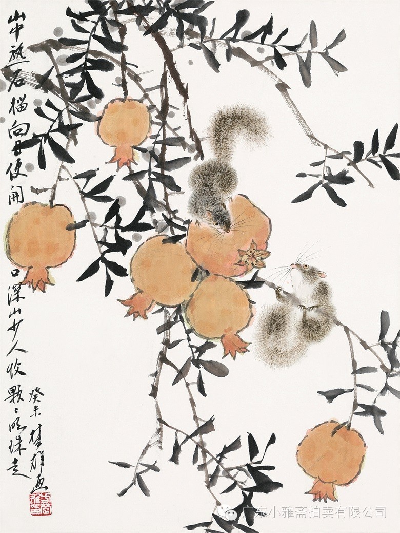 款识:山中熟石榴,向日便开口。深山少人收,颗颗明珠走。癸未,楚雄画。