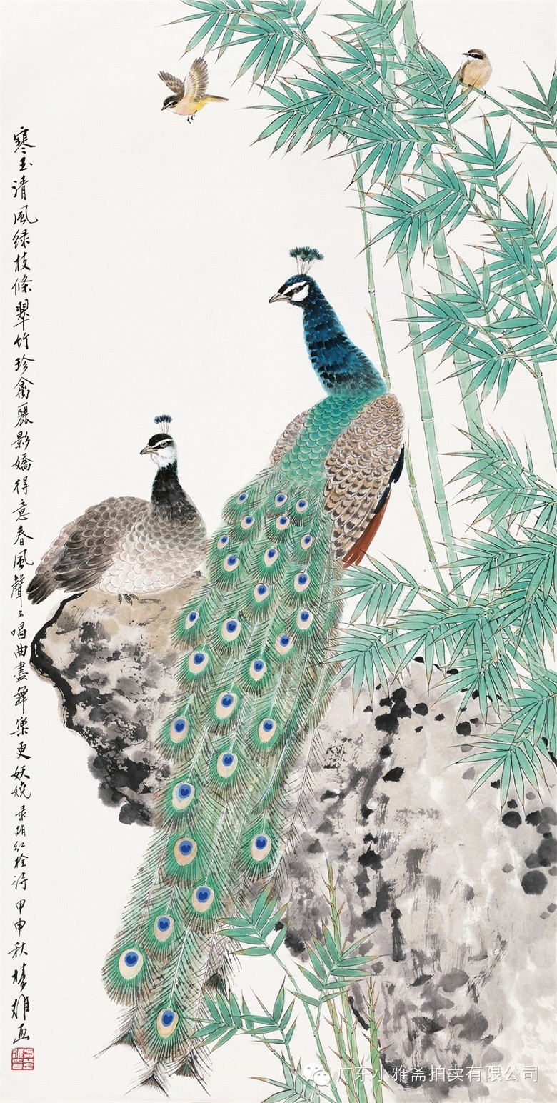 款识:寒玉清风绿枝条,翠竹珍禽丽影娇。得意春风声声唱,曲尽舞乐更妩娆。录胡红栓诗。甲申秋,楚雄画。
